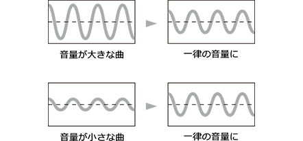 曲ごとの音量レベルの差が少なくなるように音量を揃えて再生できます。複数のアルバムの曲をシャッフル再生するときでも、音量の大小を気にせずに音楽を聴けます。
