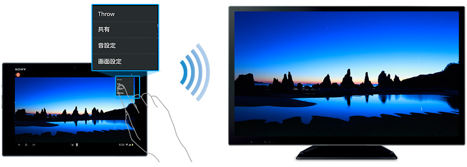 ビデオ、アルバム、ミュージックアプリケーション(旧WALKMANアプリケーション) * で管理しているコンテンツは、3つのアプリケーション共通の「Throw」ボタンから対応の機器にワイヤレスで送って手軽に再生して楽しむことができます。