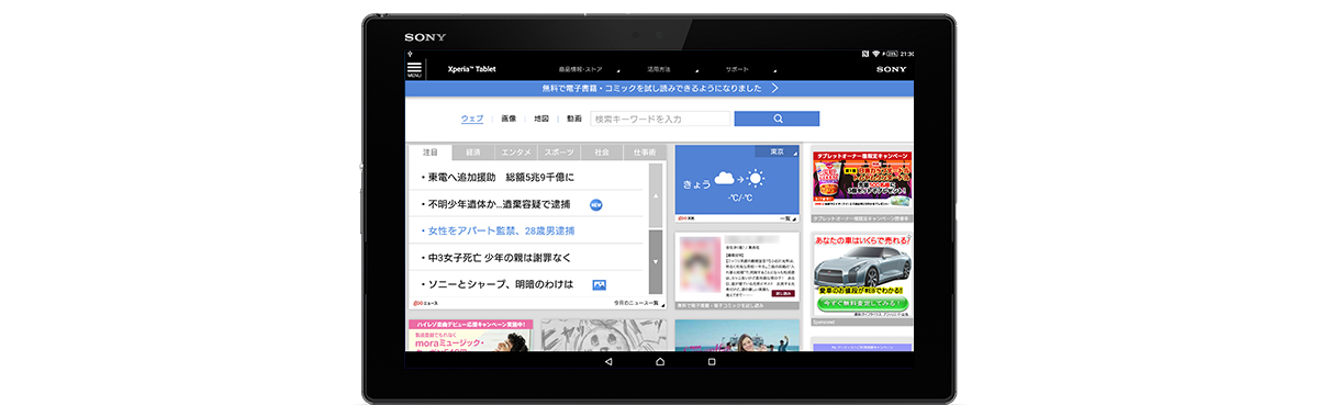 Xperia(TM) Z4 Tabletで最新の動画やニュース、トピック情報をチェックできます。ホーム画面を自分好みにカスタマイズすれば、お気に入りの動画や知りたいニュースなどがすぐ確認できるようになります。