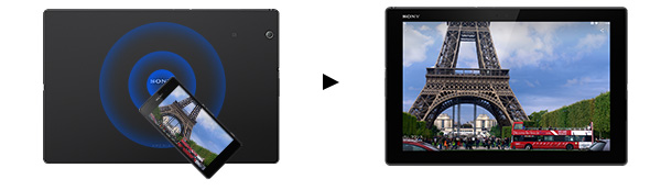 Xperia(TM) Z4 TabletをかざすだけでNFC対応のXperia(TM)スマートフォンやヘッドホン、スピーカーなどの機器と自動でペアリング/接続し、データの転送や共有をするなど、簡単に機器連携を行うことができます。