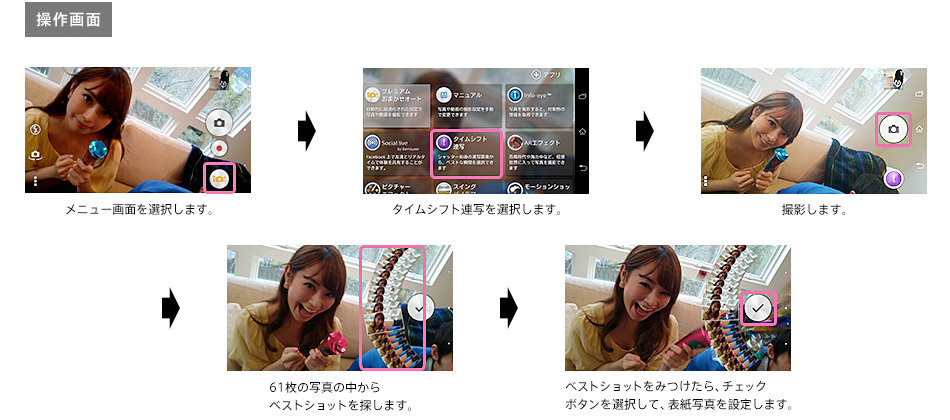 シャッターを押した瞬間と、その前後30枚ずつ、合計2秒間に61枚の写真を高速連写し、画面上ですぐ確認できます。シャッターを切る1秒前の写真も撮影可能なため、スポーツやペットの一瞬の動きを撮影したい時にも、シャッターチャンスを逃さず安心です。アルバムアプリケーションから「タイムシフト連写」の写真を選び、画面上のボタンをタップすると、連写後の計61枚を見られるユーザーインターフェースが再現されます。