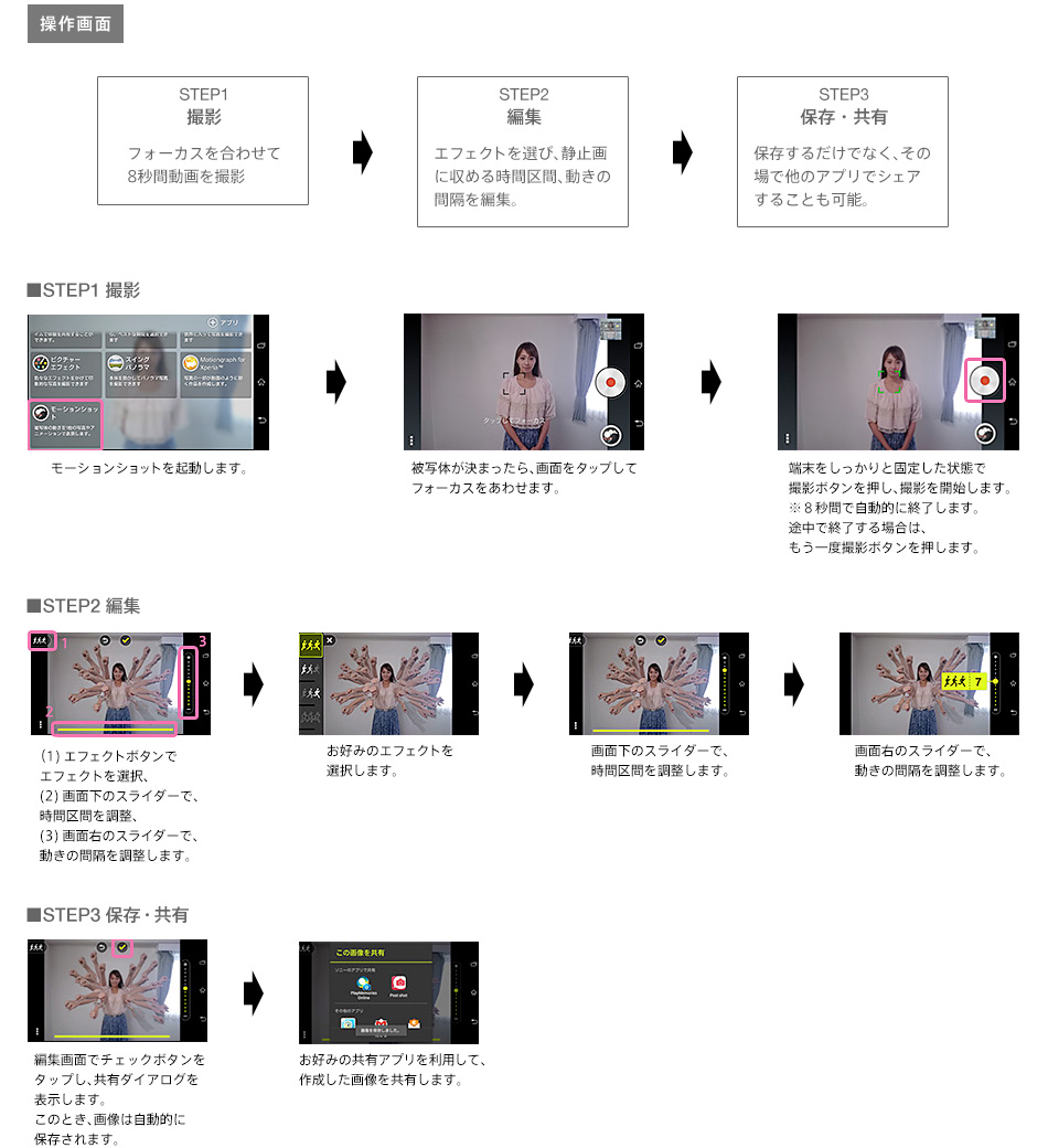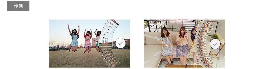 躍動感あふれるスポーツシーンや動物のかわいい動き、お子様や友人の日常のしぐさ、自動車や飛行機など、動きや表情の変化に富んだユニークな作品づくりに最適です。多彩なエフェクト機能(フェードイン/アウトなど)や表示コマ数の設定、アニメーション(*)などオリジナリティ溢れる演出を加えることもできます。完成した作品は、すぐにその場でSNSやストレージサービスなどにアップロード。楽しい思い出を保存・共有しましょう。