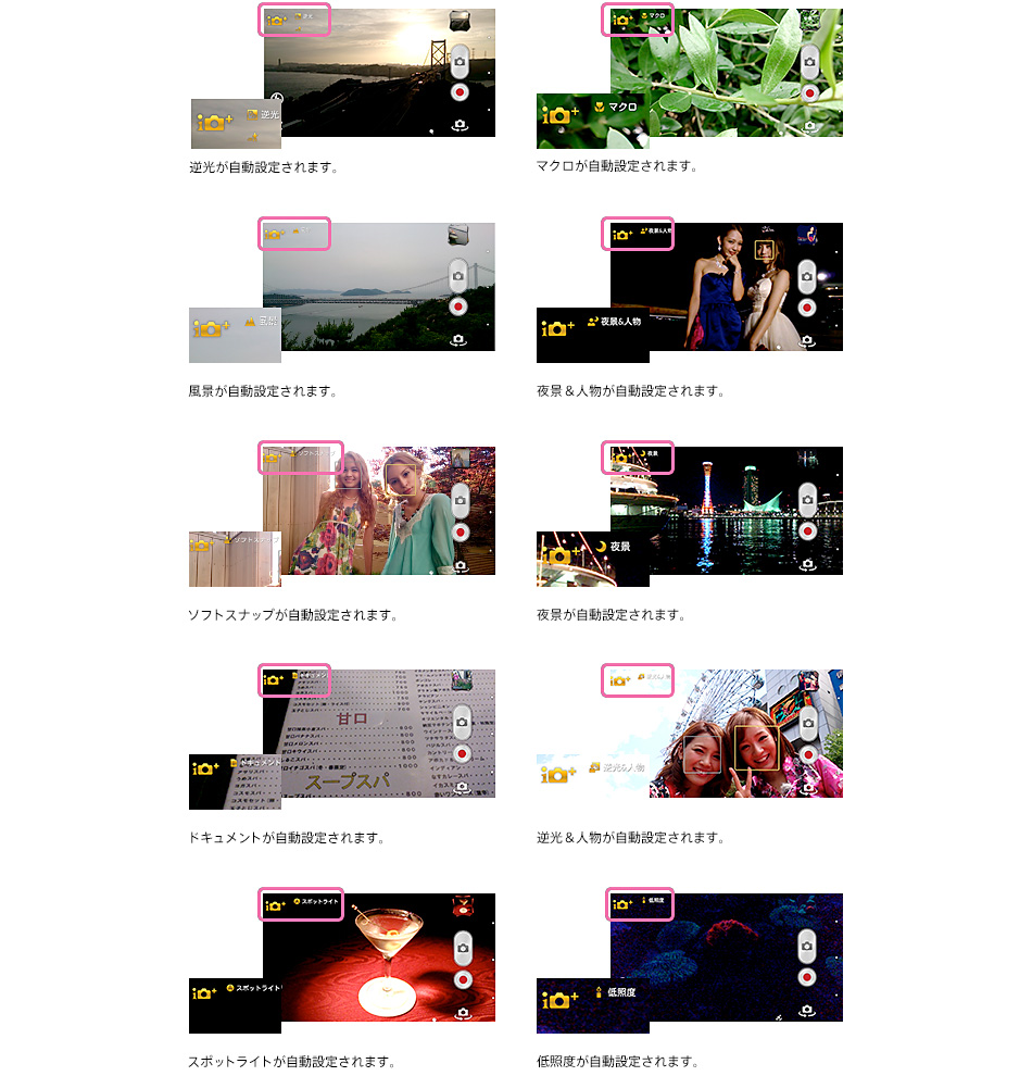 カメラがシーン認識をし、36パターンの中から最適な設定を自動で選択するので、誰でも簡単に美しく撮影することができます。例えば、逆光など明暗に差があるシーンでは、1回の撮影で露出の異なる2枚の画像を自動合成し、見た目の印象に近い自然な写真を撮影でき、明かりの少ない暗い低照度の場面では、複数枚の連写画像を重ね合わせて、ノイズを抑えたきれいで自然な明るさの写真を撮ることができます。