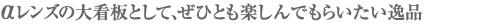 現在、ソニーα用には21本(予定)のレンズが用意されているが、なかでも135mmF2.8[T4.5]STFは他メーカーにはない「唯一無二」の交換レンズ。レンズ内に「アポタイゼーション光学エレメント」と呼ばれる、特殊なレンズを組み込んで、特徴的な描写効果を持たせている。