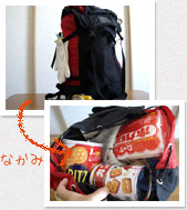 と言われそうだけど、中にはちゃんとお水とかカンパンとかタオルとか食器とか寝袋とかロープとか入っている(後半は完全にキャンプ用品だけど・・・兼用って感じです)。