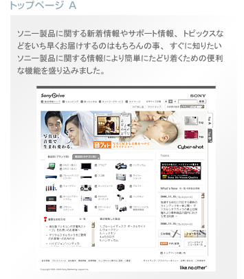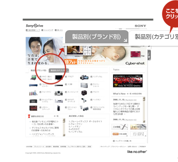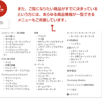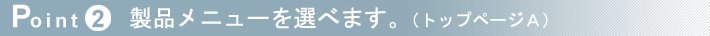 トップページAには、ご覧になりたい製品情報にいち早くたどり着けるよう、“ブランド別”メニューと、 “カテゴリ別”メニューをご用意しています。