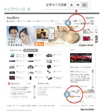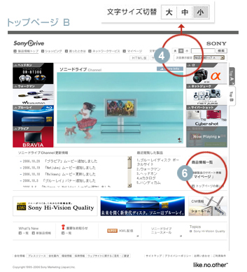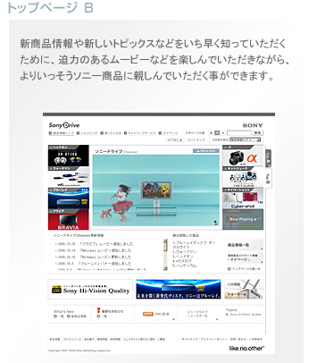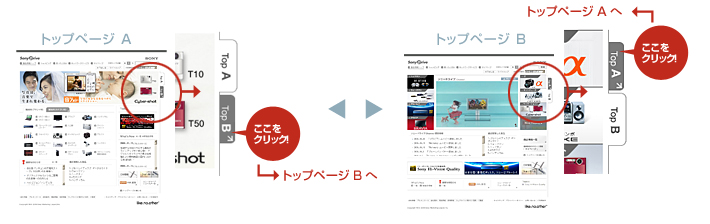 ページ右側のタブ型のボタンをクリックすると、テイストの異なる“トップページA”と“トップページB”を行き来することができます。