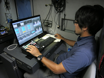 持ち出し運用時のオペレーション風景。PWSK-4403による柔軟なスロー運用、監視・管理が可能なこと、さらにスポーツ中継などで欠かせないハイライト編集が撮影・収録現場で行える点などもコンテンツ制作に威力を発揮しています。
