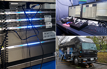 株式会社テレテック様の中継車HD-110(写真・右下)に設置されたマルチポートAV ストレージユニットPWS-4400(写真・左)。また、プロダクションコントロールステーションPWS-100PR1とUSBコントロールデバイスPWSK-4403(写真・右上)でスロー運用などを実施。