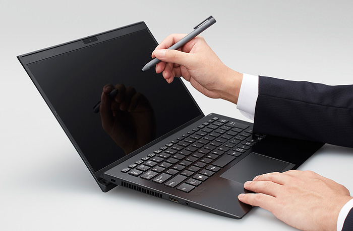 VAIO SX14-R ALL BLACK EDITIONとVAIO SX14-R 勝色特別仕様は、タッチパネルディスプレイを選択可能。スマートフォンのように画面上のボタンを押したり、フリック操作でのスクロールにも対応。別売のデジタイザースタイラス(ペン)を利用すれば、文字や絵など、より細かな書き込みが可能です。
