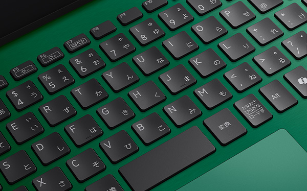 黒色のキーキャップ上に刻印される文字も黒色にした、隠し刻印キーボード(日本語/英字)*を選択可能。すっきりとした見た目を実現しつつ、タイピングできます。バックライト点灯時には刻印を光が透過し、うっすらと光ります。
