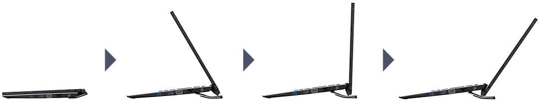 タブレット部(ディスプレイ部分)とキーボード部の「フラップ」が開き、支点を後方に移動して安定性を向上させます。この新機構を開発することで、これまで難しいとされていた、「安定性」とキーボード部を合体させた状態でも、約1kgという「軽量化」の両立に成功しました。