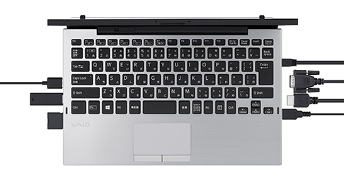 VAIO A12は、新・旧規格のインターフェイスを共存。タブレット部(ディスプレイ部分)にUSB Type-C™端子を、キーボード部に必要な全てを搭載しました。なお、HDMI/VGA端子(アナログRGB出力端子)と、USB Type-C™端子(DisplayPort)は同時出力が可能なため、内蔵ディスプレイを含めて、3画面同時出力が可能です。