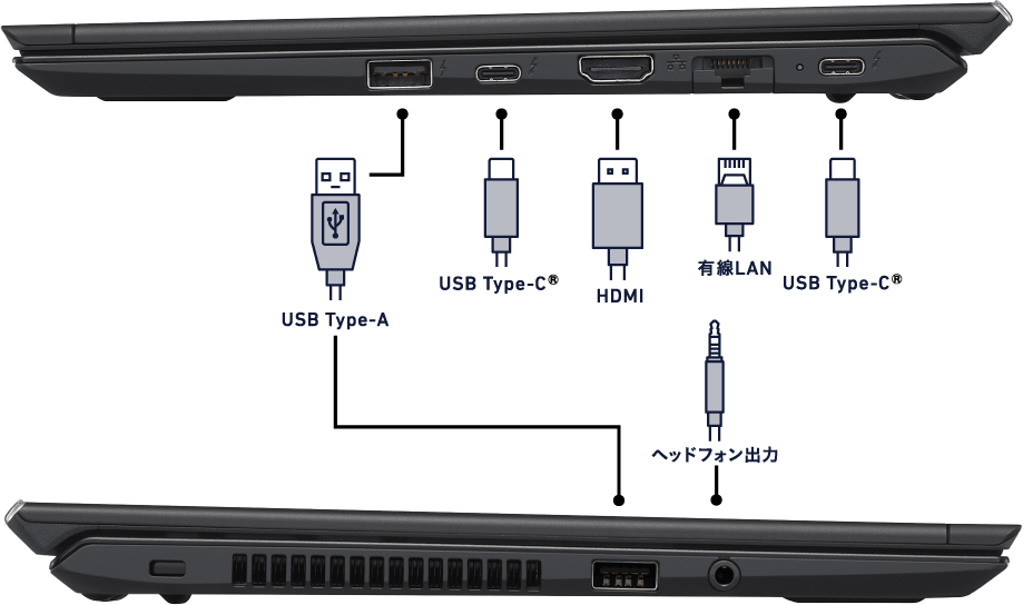 利用頻度の高いインターフェースを一通り搭載。USB Type-A端子を左右に1基ずつ搭載、2系統のUSB Type-C®端子、HDMI端子、そして有線LAN端子も備えています。