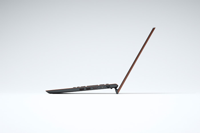 ディスプレイを開くとキーボード奥側が持ち上がり、タイピングしやすい角度のつくチルトアップヒンジ機構を実現。手首にかかる負担を軽減するだけでなく、側面ポートへのケーブルの抜き差しもしやすい設計になっています。