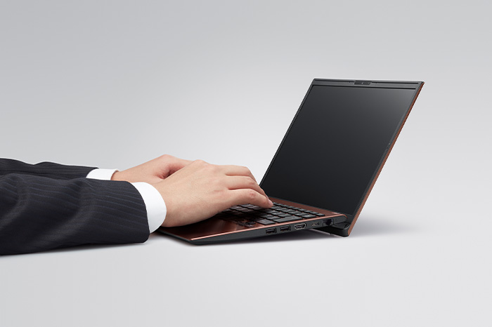 縦横比16:10のディスプレイ(1920×1200ピクセル)を採用。一般的な13.3型ワイド16:9フルHDディスプレイ(1920×1080ピクセル)と比べ、縦方向のサイズが約8.2%も増加し、縦横比16:9の14型ワイドディスプレイに匹敵する生産性を実現しました。Webサイトでの調べものからオフィスワーク、写真編集などまで、あらゆる作業がはかどります。また、ディスプレイへの映り込みを抑えるアンチグレア処理を施すことで見やすく、長時間作業しても目が疲れにくい表示を実現しています。