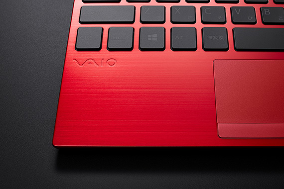VAIOの見た目の特徴の1つとなっているフラットアルミパームレストももちろん赤に。研磨・染色工程に時間をかけることで、天板同様、深みのある赤を再現しています。