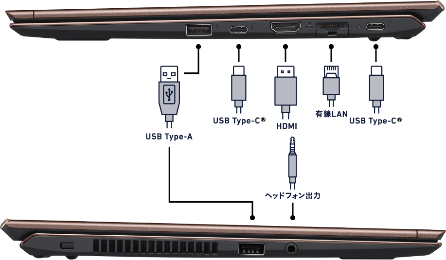 利用頻度の高いインターフェースを一通り搭載。USB Type-A端子を左右に1基ずつ搭載、2系統のUSB Type-C®端子、HDMI端子、そして有線LAN端子も備えています。
