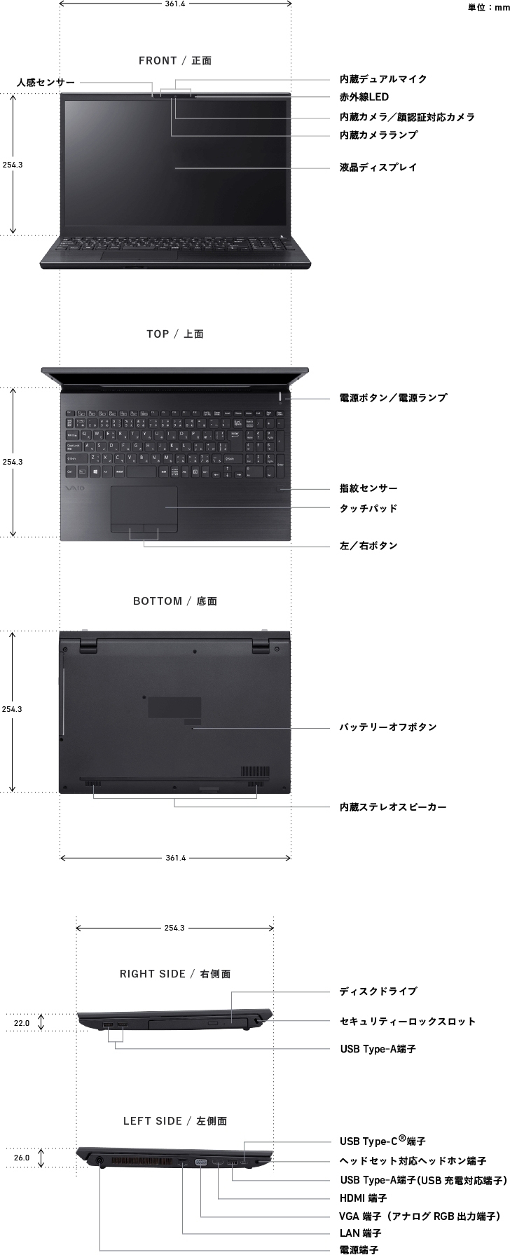 VAIO PC共通の天面VAIOロゴを黒く染め上げました。艶やかに光るブラックロゴの輝きが、マットな質感のブラックボディの中で鮮烈に浮かび上がります。