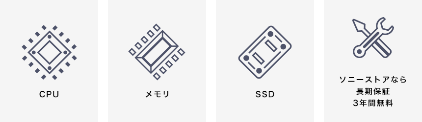 ソニーストアでは、ご購入時に本体カラー、スペック、ソフトウェアなどのカスタマイズが可能なオーダーメイド。好きなデザイン、用途・予算に応じた、お客様だけのVAIOを手に入れることができます。より高いパフォーマンスを求めるのであれば最上のCPUを、写真や動画、思い出を一つのデバイスでまとめて管理したい場合は大容量のストレージを。さらに、画像加工編集や表計算などのビジネスに必須のソフトウェアも豊富に取り揃え、セキュリティソフトウェアも同時に揃えることができるのも魅力。必要なものだけを詰め込んだ、あなただけのVAIOをお届けします。さらにソニーストアならメーカー保証と同等の内容で3年間の長期保証※を無料でご提供します。※長期保証<3年ベーシック>