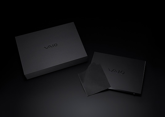 ALL BLACK EDITIONは本体だけでなく、化粧箱、付属クリーニングクロスまでオールブラックという徹底ぶり。化粧箱は表紙に黒が抄き込まれたカラー紙を貼合することで、印刷では実現不能な質の高い黒を実現しています。また、天面には黒の箔押しによるVAIOロゴをさりげなく配置しています。