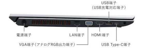 新規格のインターフェイスに加え、ビジネスの現場で使われる旧規格のインターフェイスもサポート。4K出力対応のHDMI端子、VGA端子(アナログRGB出力端子)、有線LAN端子のほか、USB Type-C端子、3つのフルサイズUSB端子、SDメモリーカードスロットなどを搭載しています。