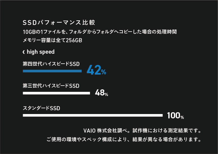 これまで以上の読み書き速度を誇るPCIe Gen.4接続の「第四世代 ハイスピードSSD」を採用。6GB/s越え*の高速ストレージ搭載は、ファイルコピーやアプリケーション起動など、日常的な作業をより快適にします。