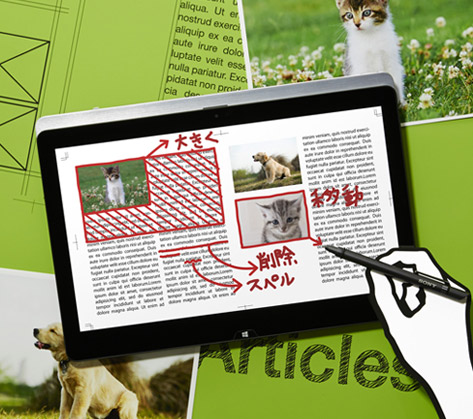 素早く手描きで - 打ち込んだテキストや口頭では、細かい部分までが伝わりにくいデザインの修正指示。VAIOならフラットな画面に直接ペンで書き込むことができるので、素早く、正確な指示が可能です。