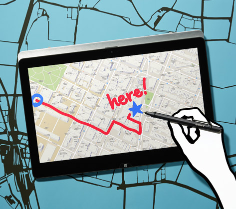 わかりやすさもアップ! - 例えば、友達に待ち合わせ場所を伝える時。マップ画面だけを送るよりも、VAIOの画面上で手書きのルートやメッセージを加えれば、よりわかりやすくなります。