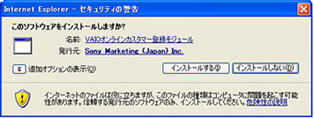 | A | 次の2点をご確認ください。 [1] 情報バーというダイアログ画面が出ている場合は「OK」をクリックしてください。 ![]() [2] Internet Explorerに新たに追加された機能「情報バー」が表示されます。 ![]() [3] 「情報バー」をクリックすると、メニューが表示されます。 ![]() [ActiveXコントロールのインストール]を選択後、以下のダイアログ画面が表示された場合は[再試行]をクリックしてください。 ![]() [4] 以下の警告画面が表示された場合、お客様のパソコンにソフトウェアがインストールされることと、インストールされるソフトウェアの発行元が記載されます。発行元に「Sony Corporation」の名称が記載されていることをご確認のうえ、「インストールする」ボタンをクリックしてお進みください。 ![]() 以上で次の画面が自動的に表示されます。 |