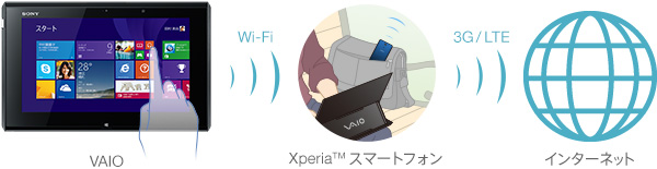 VAIOとXperia™ スマートフォンをあらかじめ設定しておくと、VAIOからXperia™ スマートフォンのテザリング機能のON/OFFを切り替えることができます。テザリング機能を使いたい時に、Xperia™ スマートフォンを操作する必要がないため、スマートにインターネット接続を楽しむことができます。