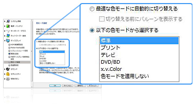コンテンツごとに、VAIOが自動で画質調整を設定。色の切り替えは、バルーンでお知らせします。また手動で選択すれば、x.v.ColorのコンテンツやICCプロファイルによるカラーマネジメントも行えます。さらに、色温度設定やMotion Realityの設定も可能です。