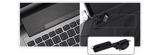 キーボードの奥にツインサテライトスピーカー、本体のボトム側にバスレフ型サブウーファーの高音質2.1chスピーカーを搭載。左右のツインサテライトスピーカーを正面に座る人の耳を狙い配置。ちょうど液晶画面の前にステージが広がるように、臨場感あふれる音を再現します。ボーカルや楽器のセパレーションがよく、音の定位にすぐれ、分解能のよいクリアな音を実現。しかも、サブウーファーにより低音が充実。ノートPCとは思えない奥行き感のある音が楽しめます。