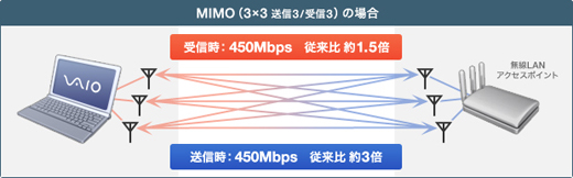 従来に比べて受信時約1.5倍、送信時約3倍の高速化を実現したMIMO(3×3 送信3/受信3、理論値450Mbps)のワイヤレスLAN機能を搭載(*2)。障害物が多く存在する環境で、より安定した送受信ができると同時に、IEEE 802.11b/gと上位互換があることから、現状の無線LAN環境の通信改善にも効果があります。