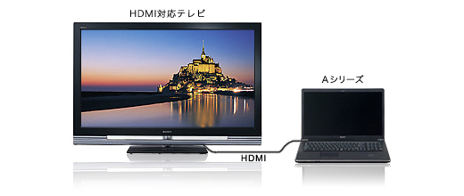 HDMIに対応した大画面テレビ接続できるHDMI出力を装備。編集中のハイビジョン映像や静止画の編集時にデュアルディスプレイとして利用することや、編集後に作品を迫力ある〈ブラビア〉の大画面で楽しむことができます。