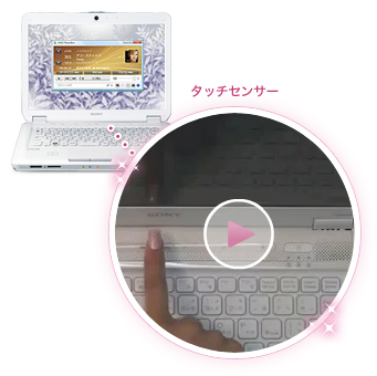 音楽やビデオの再生は液晶下のタッチセンサーで。ふれてなぞるだけの簡単な操作で、ボリュームの調節や早戻し/早送りなどができます。さらに、指の動きにあわせてセンサーが光るユニークな演出も。使いやすく、楽しい、これまでにない新しい操作感です。