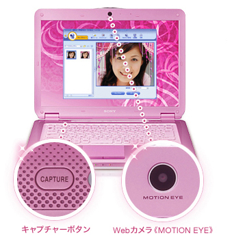 約131万画素のWebカメラ《MOTION EYE》を搭載。ビデオチャットなど、さまざまなビジュアルコミュニケーションが楽しめます。液晶下のキャプチャーボタンを押すと、付属ソフト「WebCam Companion」が起動し、撮影がスタート。手軽に“自分撮り”ができ、ブログへのアップやメールへの添付も簡単です。さらに、「Magic-i Visual Effects(マジック アイ ビジュアル エフェクツ)」で、撮影した画像に効果を加えることも可能。多彩なフレームやかわいらしいキャラクターを使って画像を演出すれば、ビデオチャットなどがもっと楽しくなります。