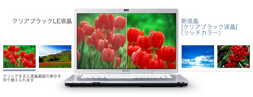 ソニー液晶テレビ〈ブラビア〉と同じアスペクト比16:9の16.4型ワイド液晶を搭載。ハイビジョンを、フル画面で視聴可能。また、液晶を従来の15.4型と同じ高さに抑えつつ、ワンランク上の17型に匹敵する広い映像表示領域で、ワイドコンテンツの迫力を余すことなく伝えます。これまでの液晶では味わえなかった映像美と感動がここにあります。