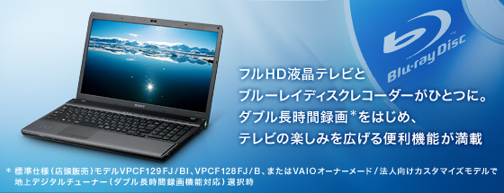 縦横比16:9の16.4型ワイド液晶[VAIOディスプレイ](Full HD 1080)を搭載(*1)。フルHD(1920×1080ドット)への対応により、ハイビジョンの映像美を余すところなく再現。ディテールまで美しく描きだします。テレビを楽しむための便利な機能も満載。ソニー独自の地上デジタルダブルチューナーにより、2つの番組を同時に長時間モードで録画したり(*2)、リアルタイムで視聴中に他の番組を録画したり、多彩なスタイルでテレビを楽しめます。