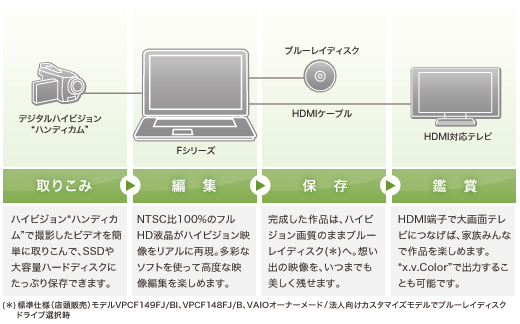 ハイビジョン編集を思いのままに楽しむために。フルHD液晶(*)や最新のアーキテクチャーの採用により、ハイビジョン映像を快適に操れる編集環境を実現。ハイビジョン“ハンディカム”で撮影した日常の何気ないシーンが、かけがえのない作品に生まれ変わります。