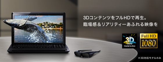 3Dメガネ1個付属、フルHD液晶搭載の3D対応モデルをラインアップ。VAIO独自の3D技術はもちろん、「フレームシーケンシャル表示方式」などソニー独自の液晶4倍速技術も惜しみなく投入したことで、クッキリ明るい3D映像を再現できます。いよいよ3Dコンテンツが充実していく中で、映像と音響が生み出す臨場感を徹底的に追求した、リアルな3D体験を手軽に楽しめるフルハイビジョン3Dノートです。