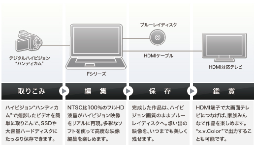 ハイビジョン編集を思いのままに楽しむために。フルHD液晶や最新のアーキテクチャーの採用により、ハイビジョン映像を快適に操れる編集環境を実現。ハイビジョン“ハンディカム”で撮影した日常の何気ないシーンが、かけがえのない作品に生まれ変わります。