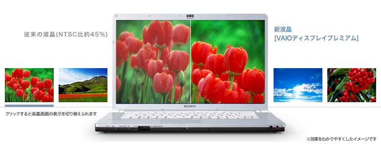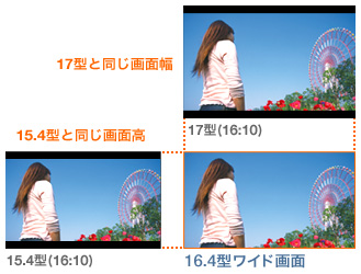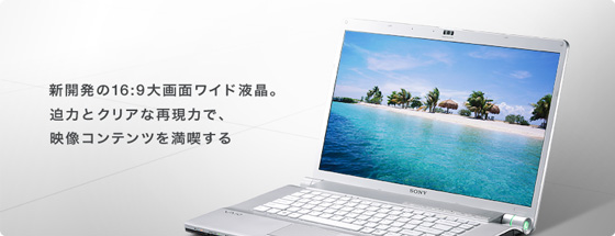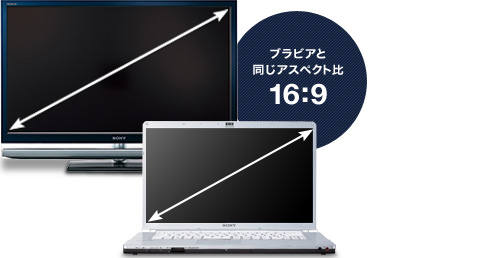 ソニー液晶テレビ〈ブラビア〉と同じアスペクト比16:9の16.4型ワイド液晶を搭載。ハイビジョンを、フル画面で視聴可能。また、液晶を従来の15.4型と同じ高さに抑えつつ、ワンランク上の17型に匹敵する広い映像表示領域で、ワイドコンテンツの迫力を余すことなく伝えます。これまでの液晶では味わえなかった映像美と感動がここにあります。