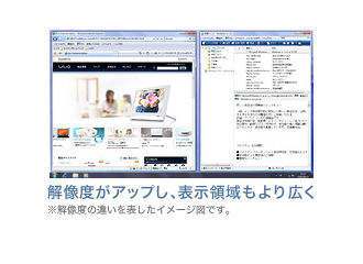 16.4型ワイドの1600×900ドット高解像度液晶を採用。ハイビジョン画質の映像も、細部に至るまできめ細かく再現します。その広い表示領域は、メールをしながらインターネットをするなど、2つのウィンドウを並べて表示しても快適に操作できます。