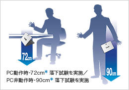 PCの前面、側面、背面それぞれの角からの落下を想定して合計26方向から落下(40cm・PC非動作時)させ、動作を確認。