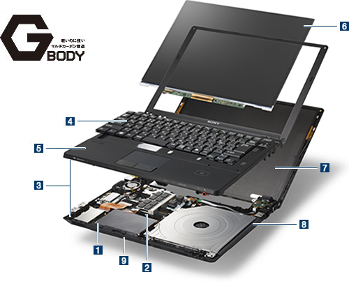 「マルチカーボン構造」で強固に鍛え上げたボディ。さらにGシリーズでは内部の構造や部品の配置・固定方法、ハードディスク保護の工夫など、堅牢性を徹底追求。強さへの信頼性を極限まで高めています。