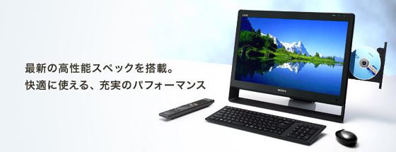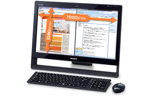 21.5型ワイドのフルHD解像度(1920×1080ドット)の液晶「VAIOディスプレイプラス」を搭載。ハイビジョン放送と同じ縦横比16:9の画面により、高精細な映像を画面いっぱいに表示可能。また、表示面積が広いので、インターネットとメールなど、2つの画面を並べて表示することもできます。
