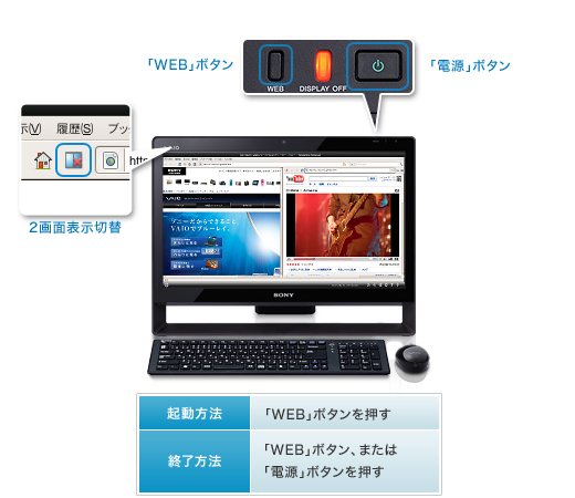 Windows OSを起動することなく、ワンボタンでインターネットブラウザーをクイック起動できます。電源オフの状態から「WEB」ボタンを押すだけで、インターネットにスピーディーにアクセス。お出かけ前など、時間のないときにニュース、天気、メールのチェックや乗り換え情報の検索などをするのに便利です。また、ブラウザーには、2画面表示のボタンを装備。ワンクリックで分割したり、閉じたりできます。動画サイトを見ながらWebページを参照するなど、 2つの画面を並列に表示して楽しめます。
