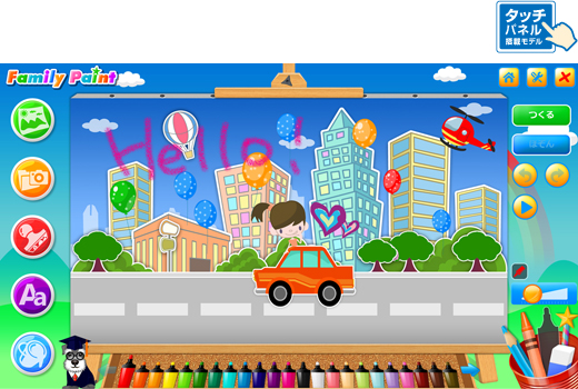 「Family Paint」は、誰でも手軽にお絵かきを楽しめるソフトウェア。タッチパネル対応なので、紙に描く感覚で画面に直接触れて楽しめます(*)。動物、乗り物などのスタンプや楽しいテンプレートが満載。写真を取りこんで、メッセージやイラストを入れることもできます。