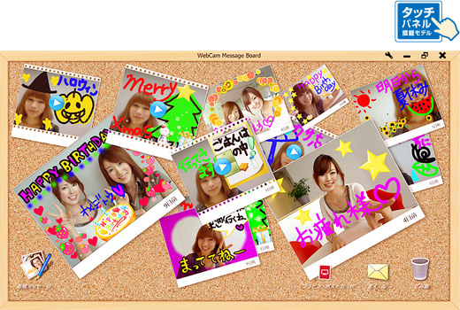本体にウェブカメラとマイクを内蔵。ウェブカメラで撮った写真やビデオに、タッチ操作(*)でメッセージやイラストを描いて楽しめます。ペンや色を選んで自由に文字を書いたり、あらかじめ用意されているフレームやイラストを貼り付けたり。楽しいメッセージを作成したら、その場でメールに添付して家族や友達に送信。家族へのメッセージをそのままディスプレイに表示させておけば、メッセージボード代わりに利用できます。